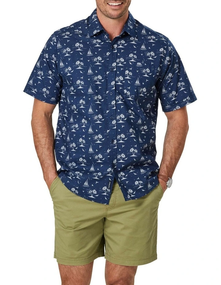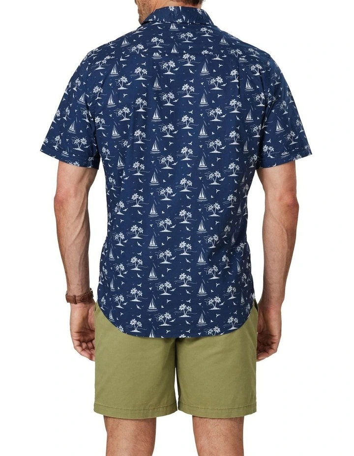 This light weight cotton shirt features a stylish island pattern that makes for a fun and easy weekend option. This regular fitting shirt is made from a soft cotton that pairs well with denim for a casual off duty style.
