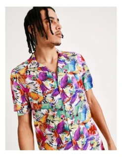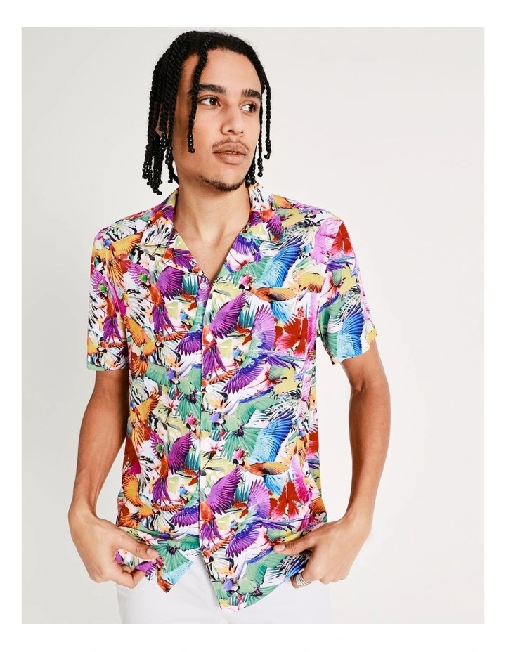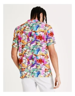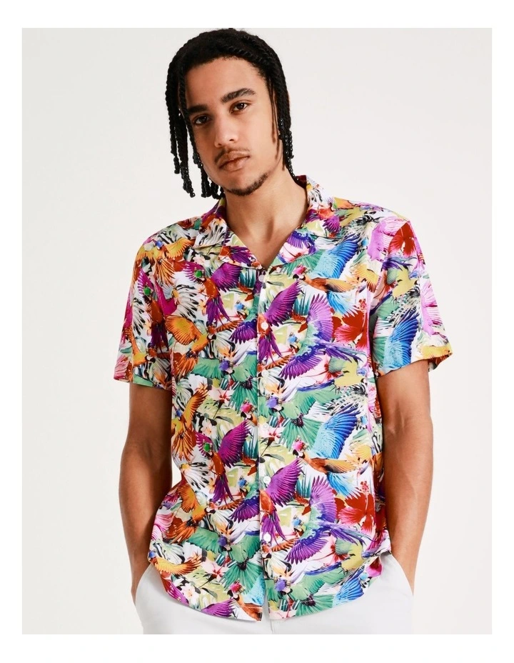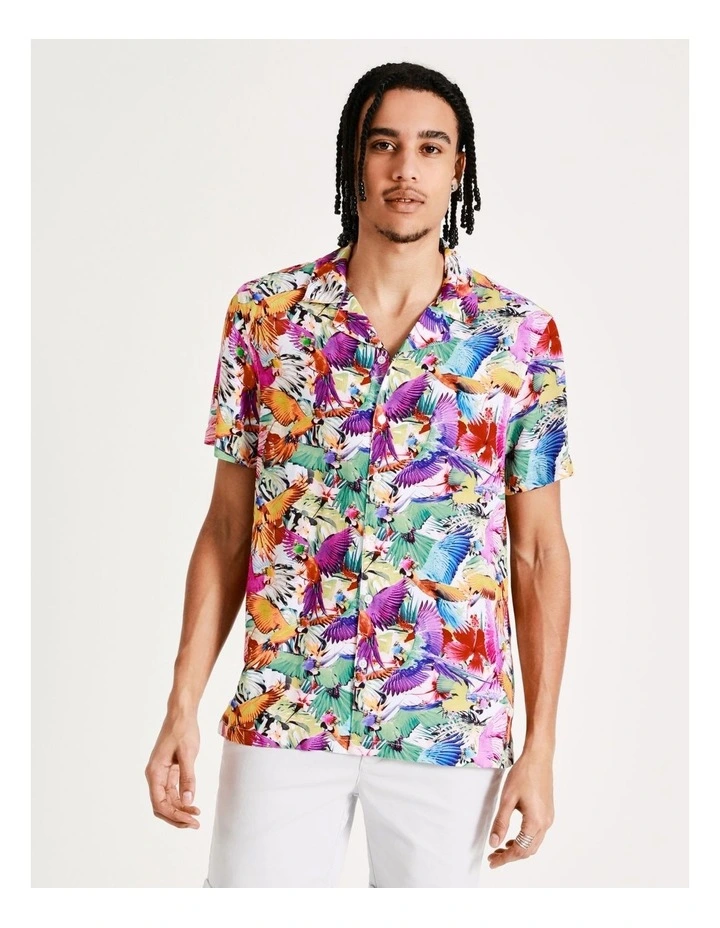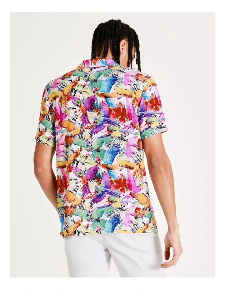 Kenji Drunken Birds Print Short Sleeve Rayon Shirt In White