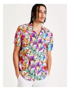 Make a statement in a short sleeve shirt. This shirt has a button up opening with a bold, all-over print. Wear it with denim for an elevated casual look.