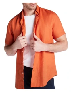 Offered in a range of colourways, this short sleeve shirt blends comfort and design, while remaining soft, cool and breathable in lightweight linen. Papaya orange in colour, the shirt creates an effortless relaxed fit that can be worn on its own or layered over a tee, revealing design details that include a white button fastening, a sharp shirt collar, and curved shaping at the hem.