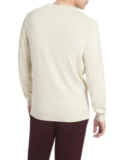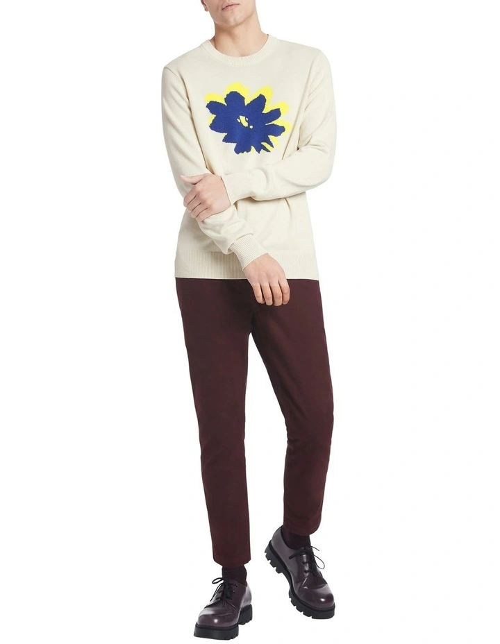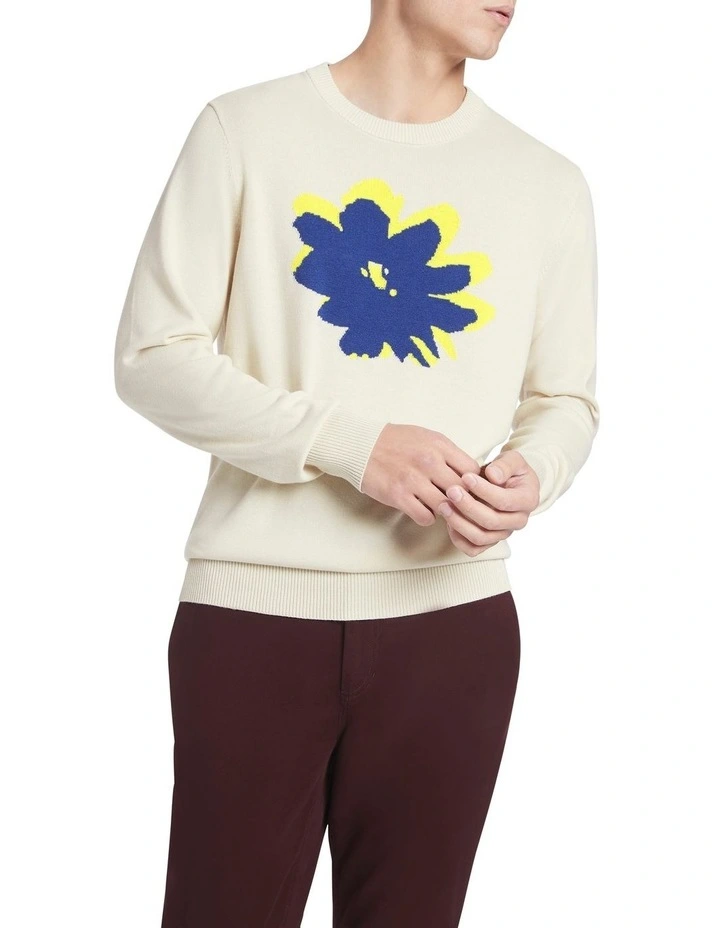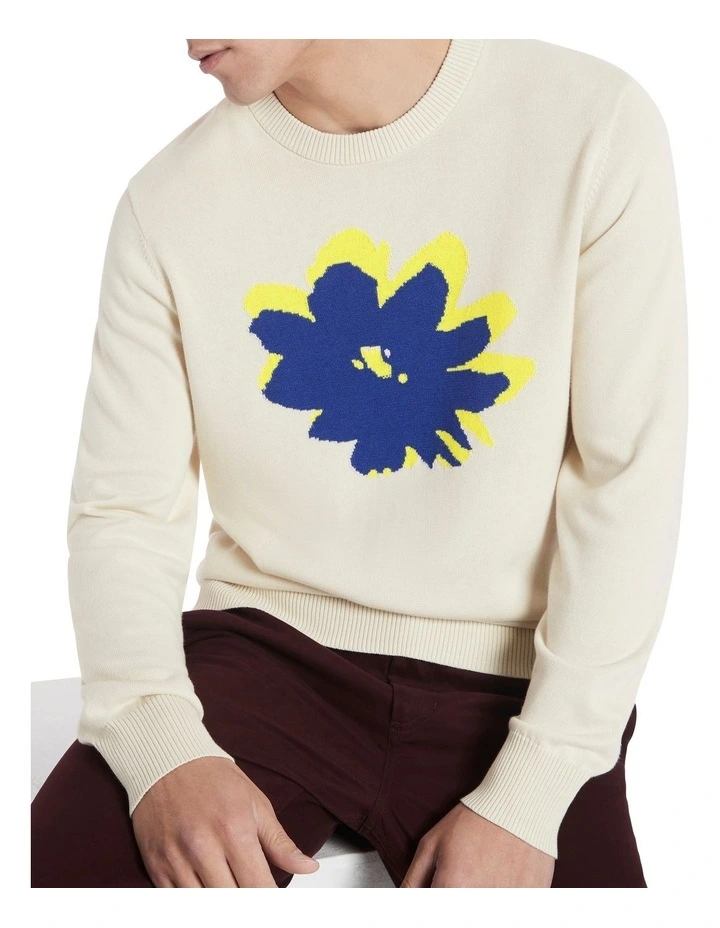 Ecru in colour, this knit sweater plays against its neutral base colouring with an abstract flower intarsia across the chest, bold in corn yellow and blue. Made from a mid-weight cotton yarn, the sweater is great for layering, revealing a regular fit through the body and long sleeves, finished with chunky rib trim at the crew neckline, cuffs and body hem.