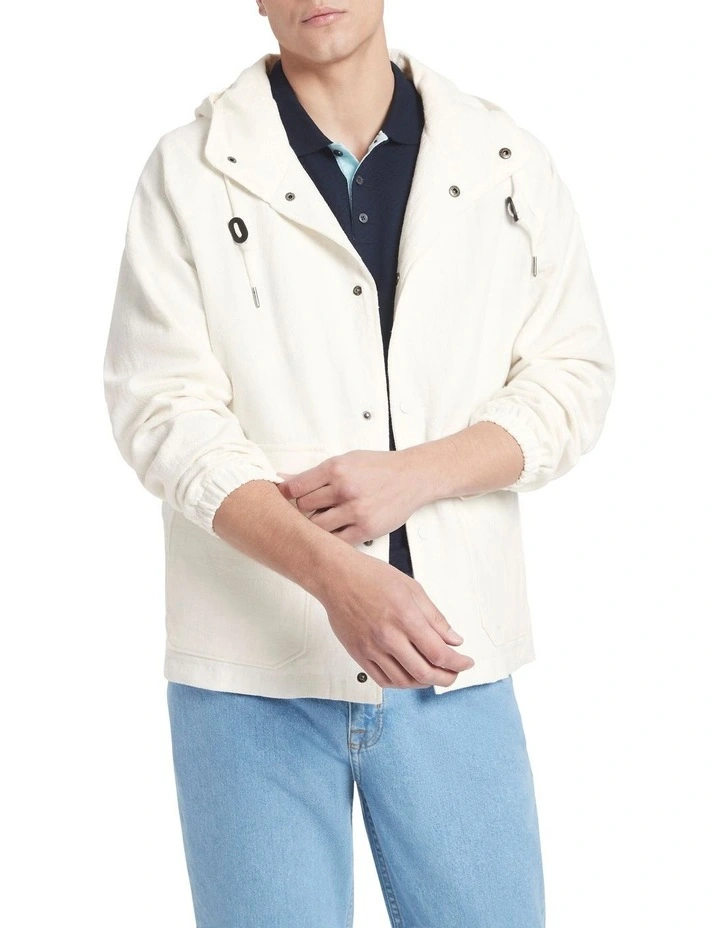 Perfect for layering in effortless ecru, this jacket reveals a softly textured look, made from a blend of ramie and cotton. Featuring a contrast stripe lining, the jacket creates a regular fit with a snap button front fastening, completed by a full hood with drawstring ties, elasticated cuffs, and snap button flap patch pockets at the front of the waist.