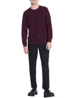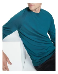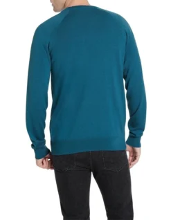 Creating a lightweight look made from pure Australian new Merino wool, this long sleeve knit sweater is so soft, youll want to wear it with everything. Offered in a gorgeous teal colouring, the sweater shows off a regular fit with raglan shaping at the shoulders, finished with fine rib trim at the crew neckline, cuffs and body hem.
