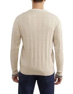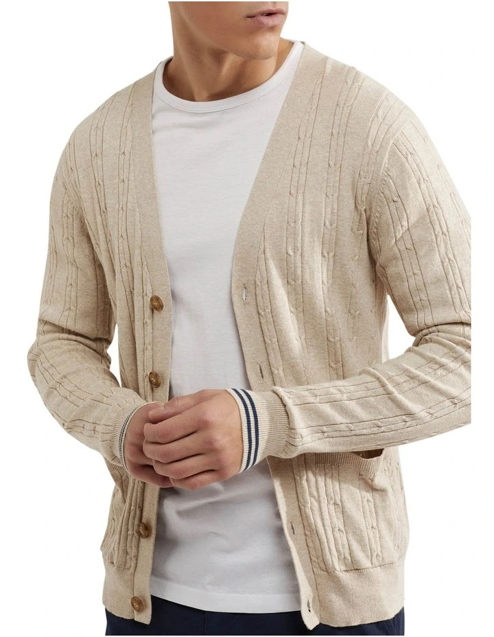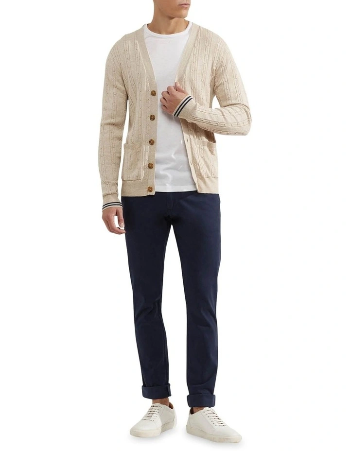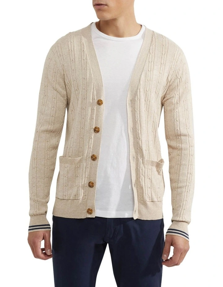 Give your look a preppy edge with the Rusty Cable Cardigan. This slim fit knit is crafted from cotton making it perfect for transeasonal layering. It features a classic cable knit pattern with contrast cuff stripes, side patch pockets, and tortoiseshell buttons. Team it with chinos and sneakers to complete the look.