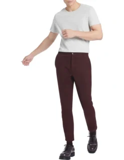 Revealing a rich merlot hue, these chinos show off a sueded look made from soft cotton twill, featuring just a hint of stretch for comfort and movement. Fastening at the front with a concealed fly and tortoiseshell button closure, the pants descend through tapered leg shaping to full length, finished with an elasticated back waistband, and pocketing front and back.