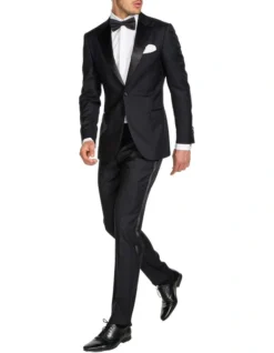 M.J. Bale’s Saunders Black Satin Trousers, cut in a slim fit with 100% Super Fine Merino Wool. The trousers feature a side satin tape design for the more formal events, along with this they come half-lined with side adjusters and jet pockets. Pair with the Saunders Black Tuxedo jacket to complete a powerful formal ensemble.