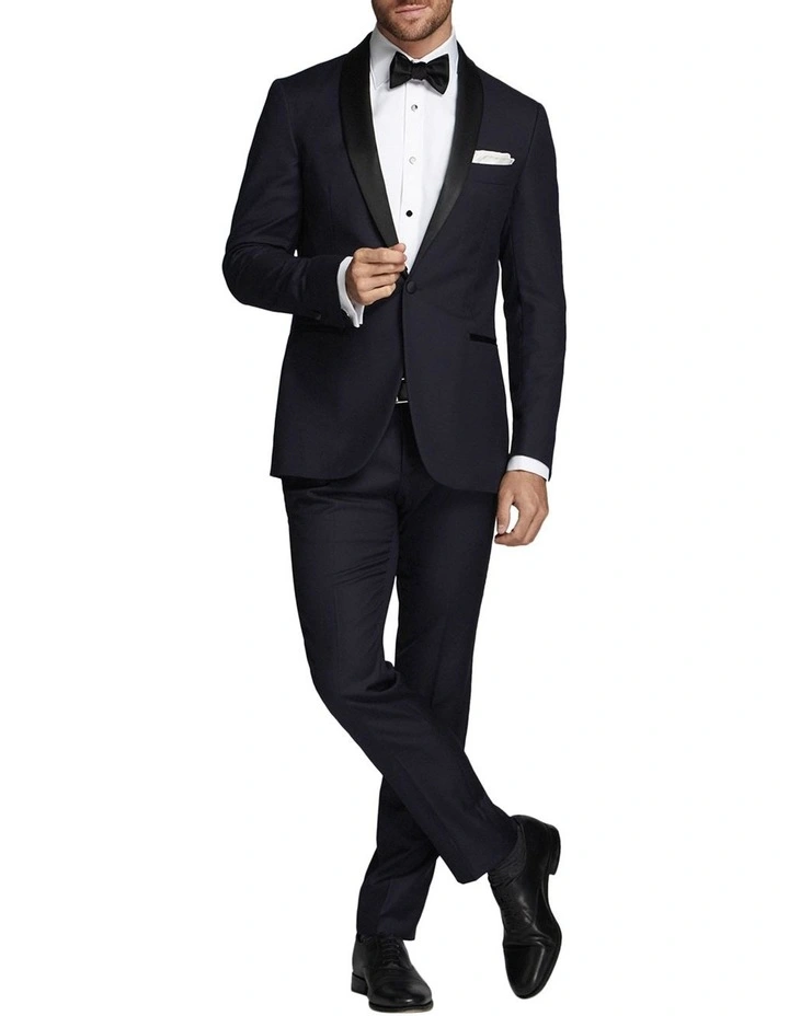 Polished and sophisticated, M.J. Bale’s Saunders Navy Tuxedo Jacket is a classic choice for formal occasions. The sleek satin shawl lapels and single button bring depth to navy blue 100% Merino wool, while twin vents and functional buttons ensure the piece is as practical as it is perennial. Pair with the Saunders Slim Trousers for an unrivaled formal Tuxedo option.