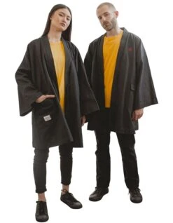 Shogun Unisex Overcoat is a unique kimono-style piece designed and made in Melbourne. Made from quality hemp/organic cotton fabrics with biodegradable (corozo) buttons for the pockets. Hidden pocket at front chest where you can keep your valuables close to you. Layer it with your favourite hoodie and t shirt and make your green statement.